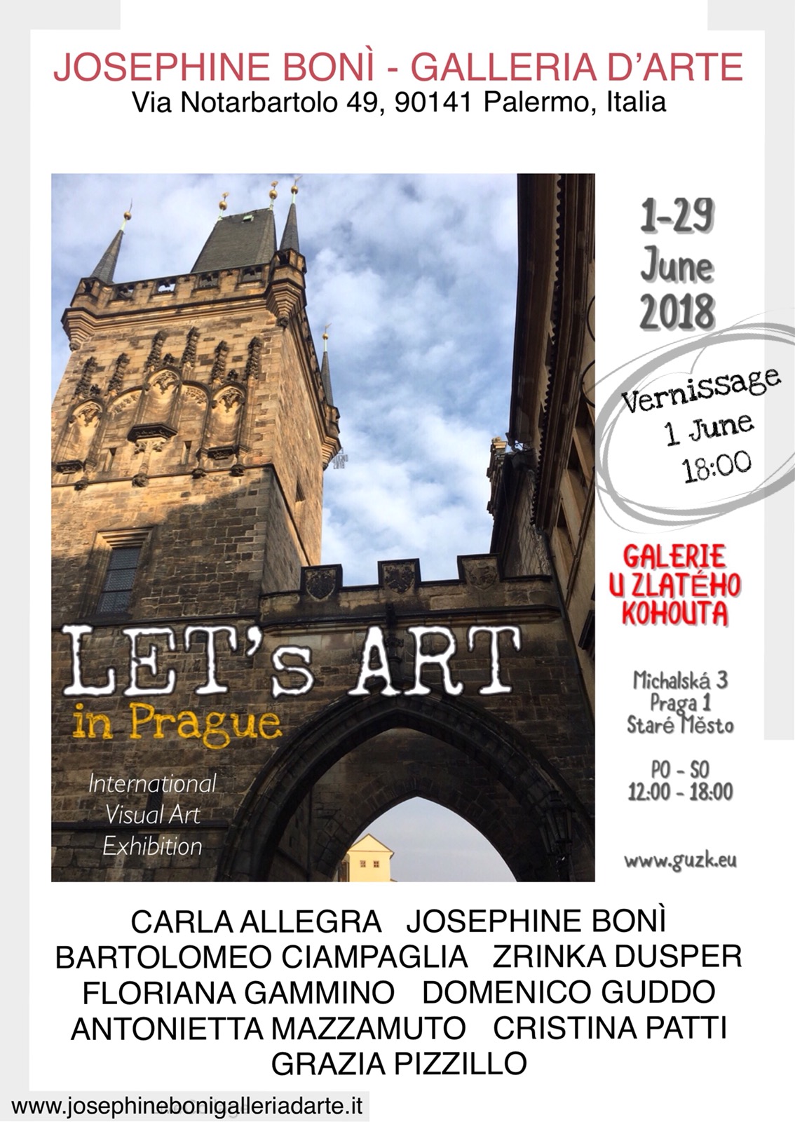 CARLA ALLEGRA,JOSEPHINE BONÍ,BARTOLOMEO CIAMPAGLIA,ZRINKA DUSPER,FLORIANA GAMIMINO,DOMENICO GUDDO,ANTONIETTA MAZZAMUTO,CRISTINA PATTI,GRAZIA PIZZILLO. IN PRAGUE 1.06. – 29.06. VERNISAŽ 1.06. V 18 H
